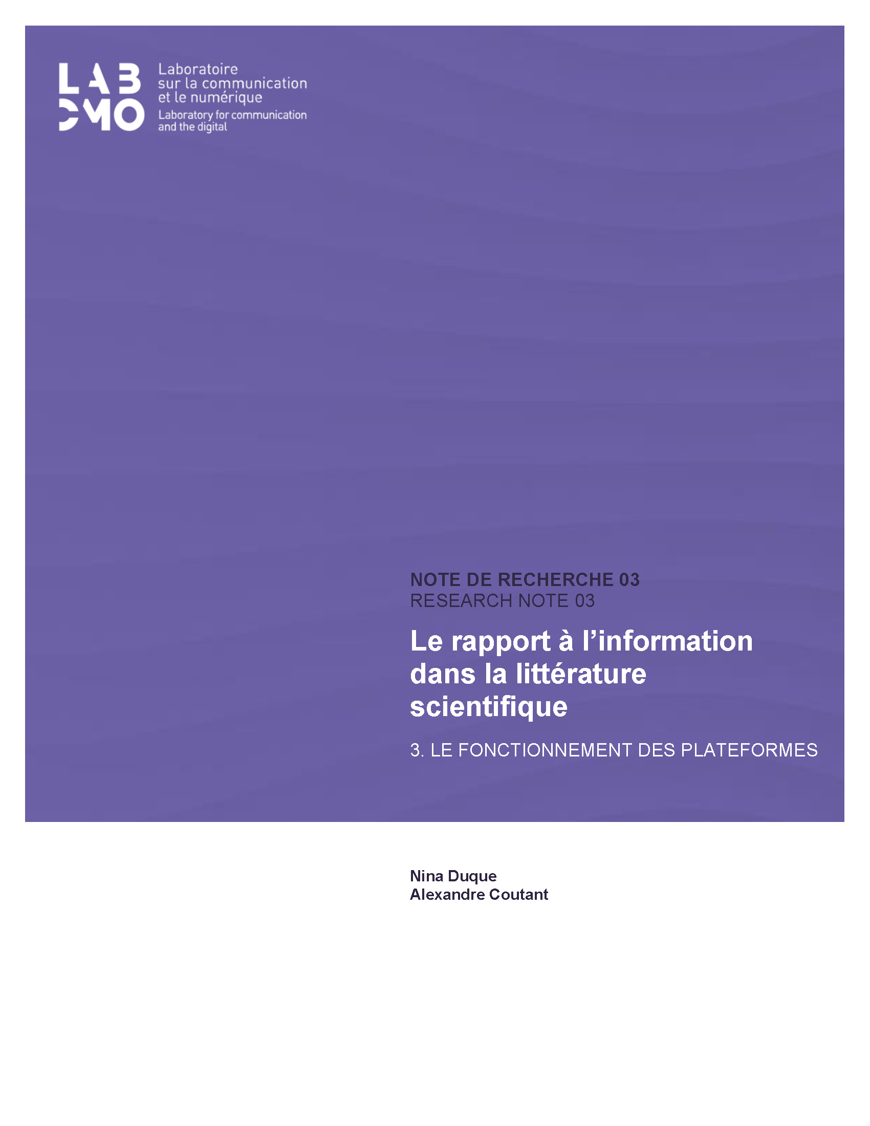 Duque, N., Coutant, A. (2025). Le rapport à l'information dans la littérature scientifique. 3. Le fonctionnement des plateformes. Les notes de recherche du LabCMO, 03, Montréal-Laval : Laboratoire sur la communication et le numérique.